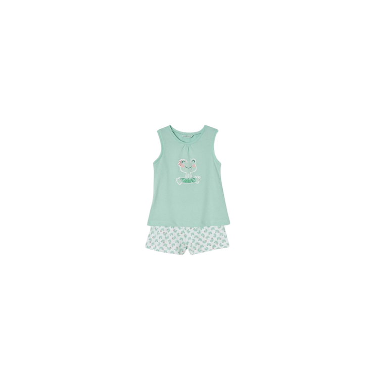 O Pijama Mayoral Sky Verde é perfeito para meninas que querem aproveitar a primavera e o verão com conforto e liberdade. Confeccionado em tecido leve, o pijama é composto por duas peças práticas: top sem mangas e shorts com elástico na cintura para ajuste perfeito.